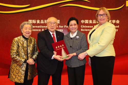 CIFST理事長(zhǎng)藩蓓蕾和IUFoST秘書長(zhǎng)朱迪為伍沾德博士頒發(fā)“中國(guó)食品工業(yè)特殊貢獻(xiàn)獎(jiǎng)”
